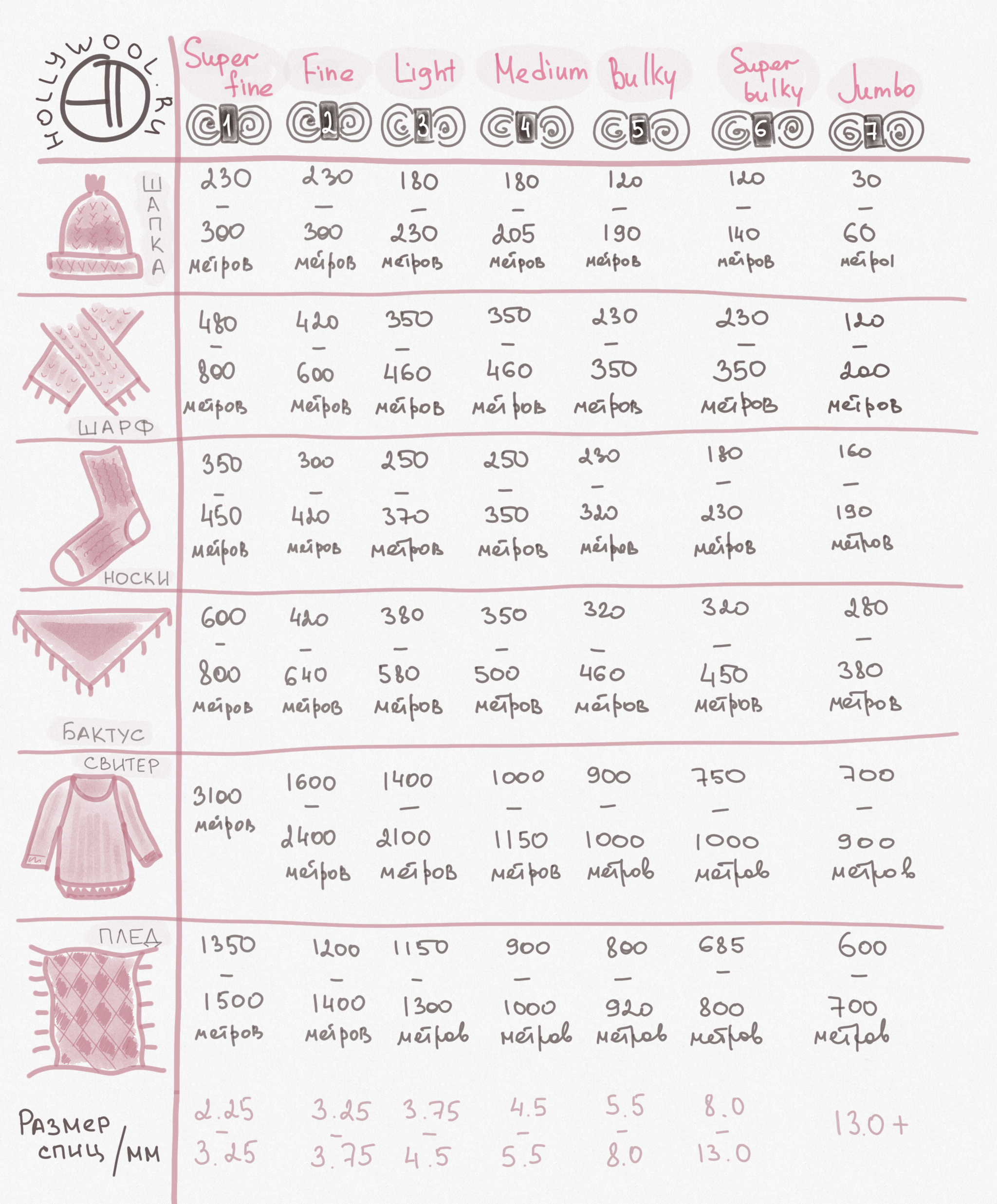 Таблица содержит информацию по ПРИМЕРНОМУ расходу, она не учитывает такие нюансы, как вязание образцов, наличие в изделии кос или аранов, свободы облегания. Поэтому при пользовании таблицей важно учитывать все детали и брать пряжу с запасом.