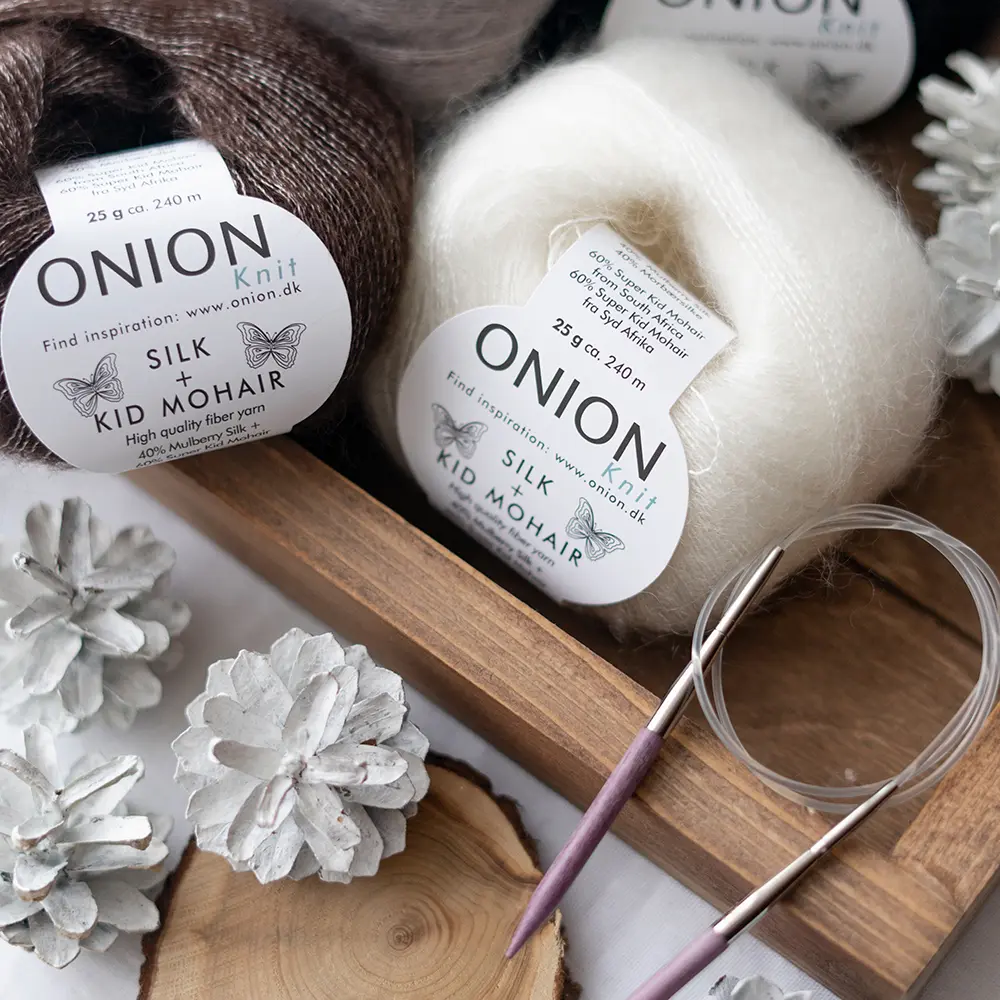- Onion Silk+Kid Mohair — 60% Супер кид мохер, 40% Шёлк, 240м/25гр. Самый нежный кид-мохер, который мы знаем.
