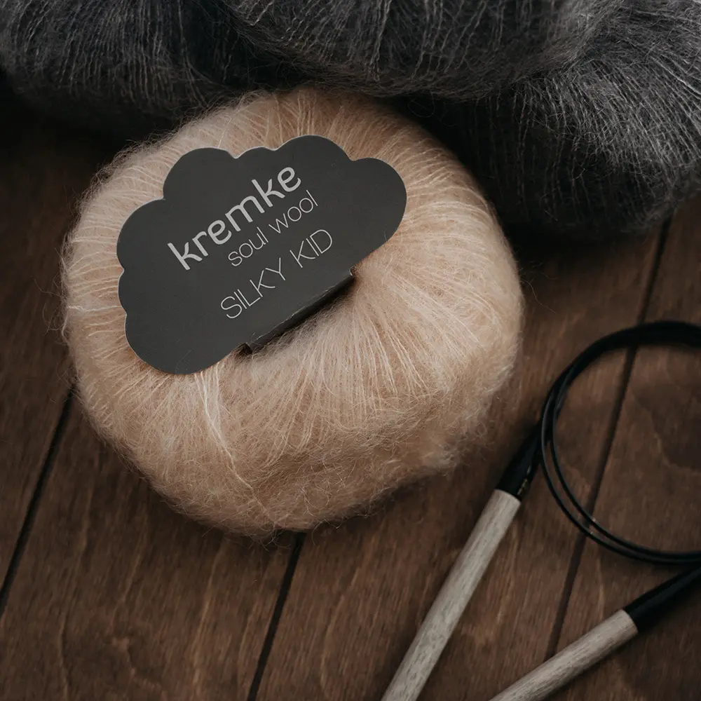 - Kremke Silky Kid — 72% Кид мохер, 28% Шёлк, 210м/25гр. Шикарная палитра и достаточно длинный, эффектный ворс.