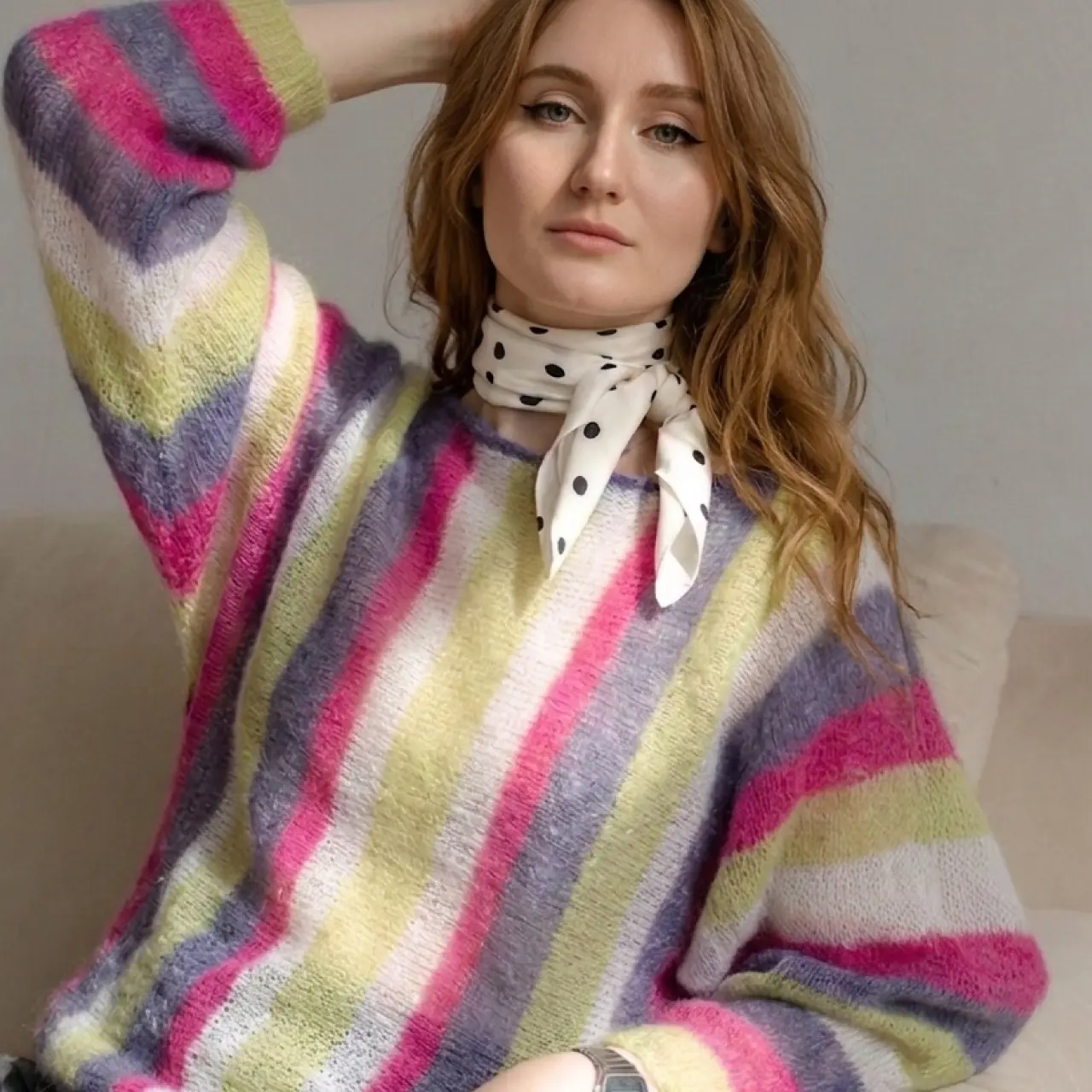 Джемпер оверсайз из мохера с вертикальными полосками. Вяжется из двух частей поворотными рядами от низа рукава с прибавками до середины изделия. Далее две части соединяются по середине переда и середине спинки швом «петля в петлю». Горловина – «лодочка».