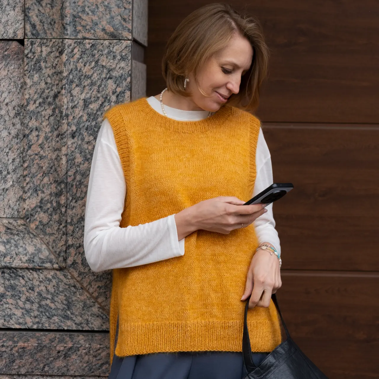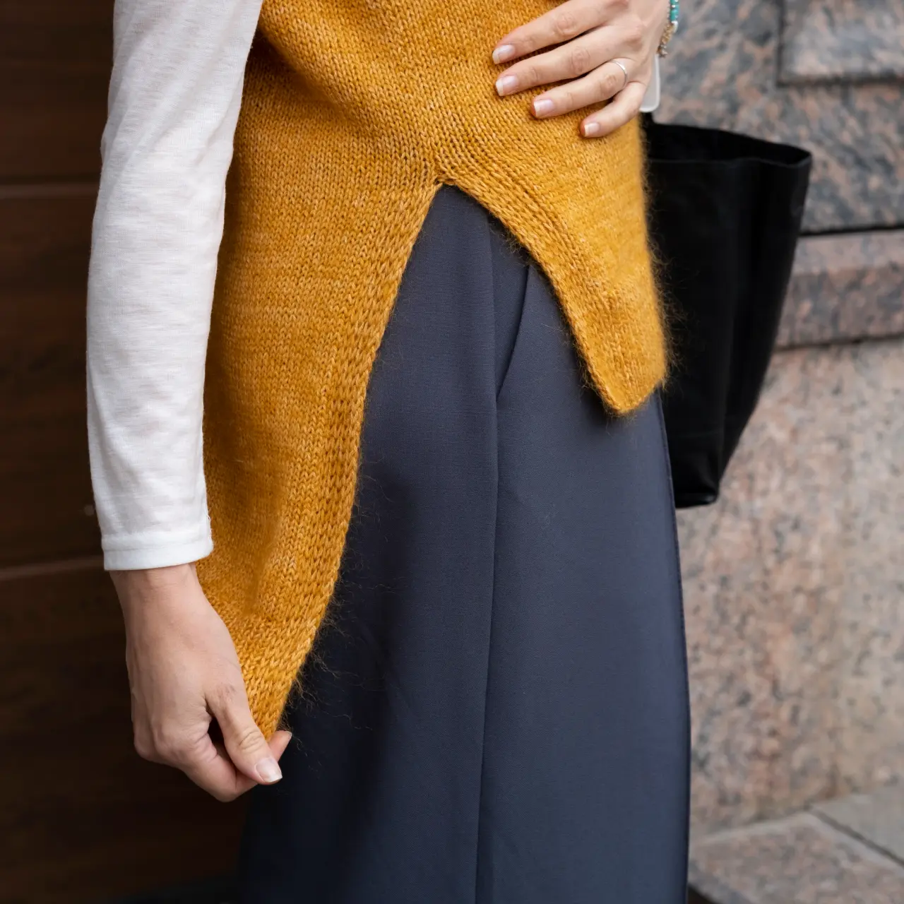 Уникальный жилет с удлиненной спинкой – стиль, комфорт, элегантность и тепло! Жилет вяжется отдельными деталями (спинка и перед), при этом спинка удлиненная, что добавляет изюминку и делает изделие особенно удобным для осенне-зимнего сезона. Декоративная отделка по бокам из резинки с вытянутыми лицевыми петлями делает изделие не только функциональным, но и визуально интересным. Такой акцент добавляет динамичности и привлекает внимание. Этот жилет — идеальный спутник для прохладных дней, когда хочется не только согреться, но и выглядеть сдержанно и изысканно.