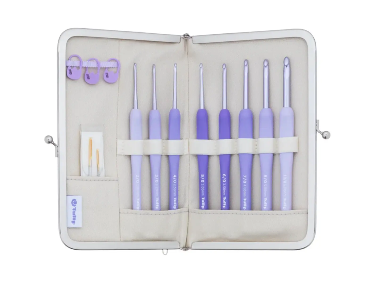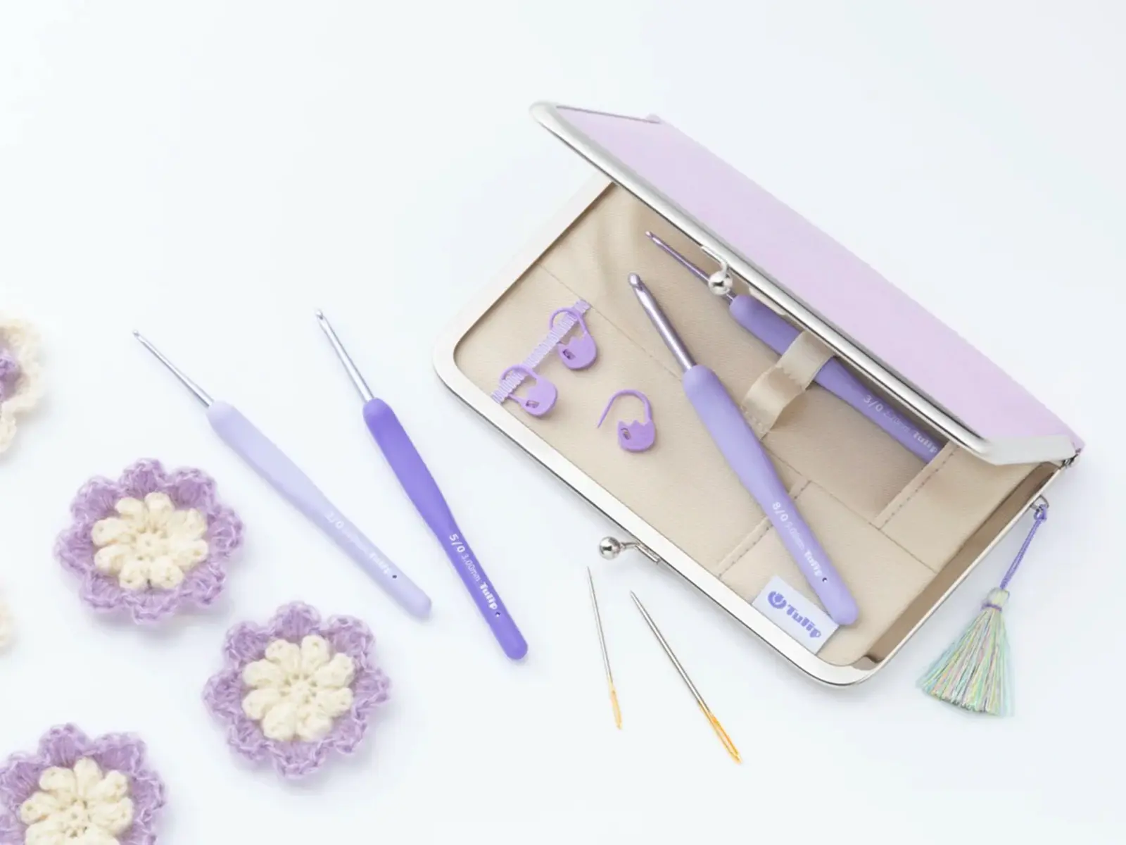 Подарочный набор ETIMO Murasaki включает 8 крючков (размеры: 2.00, 2.20, 2.50, 3.00, 3.50, 4.00, 5.00, 6.00 мм). Каждый крючок оснащён удобной мягкой ручкой для комфортного вязания. В комплект входят специальные гобеленовые иглы и маркеры для петель. Все аксессуары аккуратно размещены в удобном футляре ручной работы с застёжкой "гамагути", изготовленном мастерами из Киото. Чехол украшен пастельной кисточкой, а внутри есть ленты для фиксации маркеров и кармашки для хранения аксессуаров.