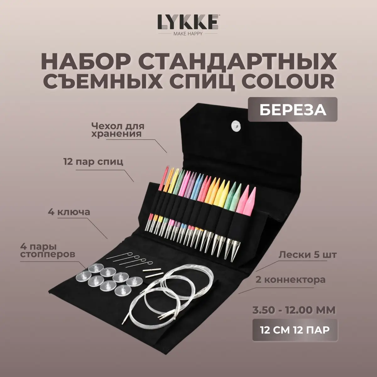 - 12 пар спиц: 3.50, 3.75, 4.00, 4.50, 5.00, 5.50, 6.00, 6.50, 8.00, 9.00, 10.00 и 12.00 мм;